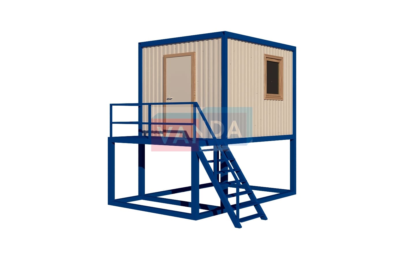 Пост охраны на подиуме №4 (вариант 3) изготавливается из несущего каркаса (верхняя и нижняя обвязка): швеллер 100х50х3 мм., угловые стойки: сложно - гнутый угол 90х90х3 мм., крыша блок-контейнера: металл сварной 0,9-1 мм., качественная наружная отделка: оцинкованный профлист, вспомогательный деревянный каркас (стены) выполнен из брусок 40х75 мм., лаги пола: обрезная доска 40х100 мм., лаги потолка: обрезная доска 40х100 мм., выполнено утепление: Минеральная вата «ISOVER» – 50 мм. и пароизоляция: плёнка техническая, черновой пол состоит из: обрезная доска 20 мм. (2 сорт), чистовой пол покрыт: ДСП строительное 16 мм., отделка пола выполнена из качественных материалов. Контейнер комплектуется окнами: деревянное, двойное остекление 800х1000, входной дверью: ДГ 21-8 обшита снаружи оцинкованным листом, врезной замок и внутренними дверями. Если в БК присутствуют перегородки, то для них используется: брусок 40х50 мм. Лестница постамента имеет перила, тетива лестницы выполнена из профтрубы 30х60 мм., ступени из уголка 25х25х3 мм., просечной лист, перила из профтрубы 20х40 мм., площадка перед входной дверью имеет ограждение.